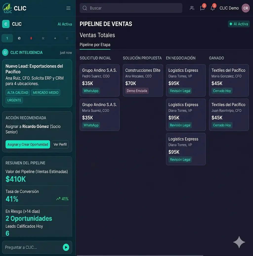 CLIC es una barra lateral de IA integrable que se conecta a tus sistemas empresariales existentes y potencia cada proceso con inteligencia, recomendaciones y automatización en tiempo real.