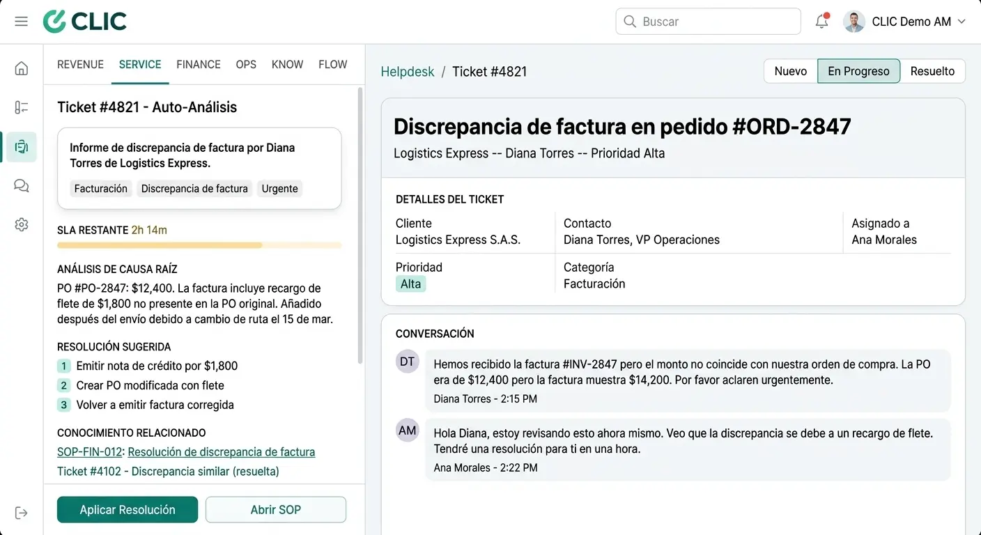 CLIC clasifica automáticamente los tickets entrantes, encuentra las causas raíz, sugiere resoluciones basadas en tu base de conocimientos y detecta riesgos de escalamiento — todo mientras el agente trabaja en Odoo Helpdesk.