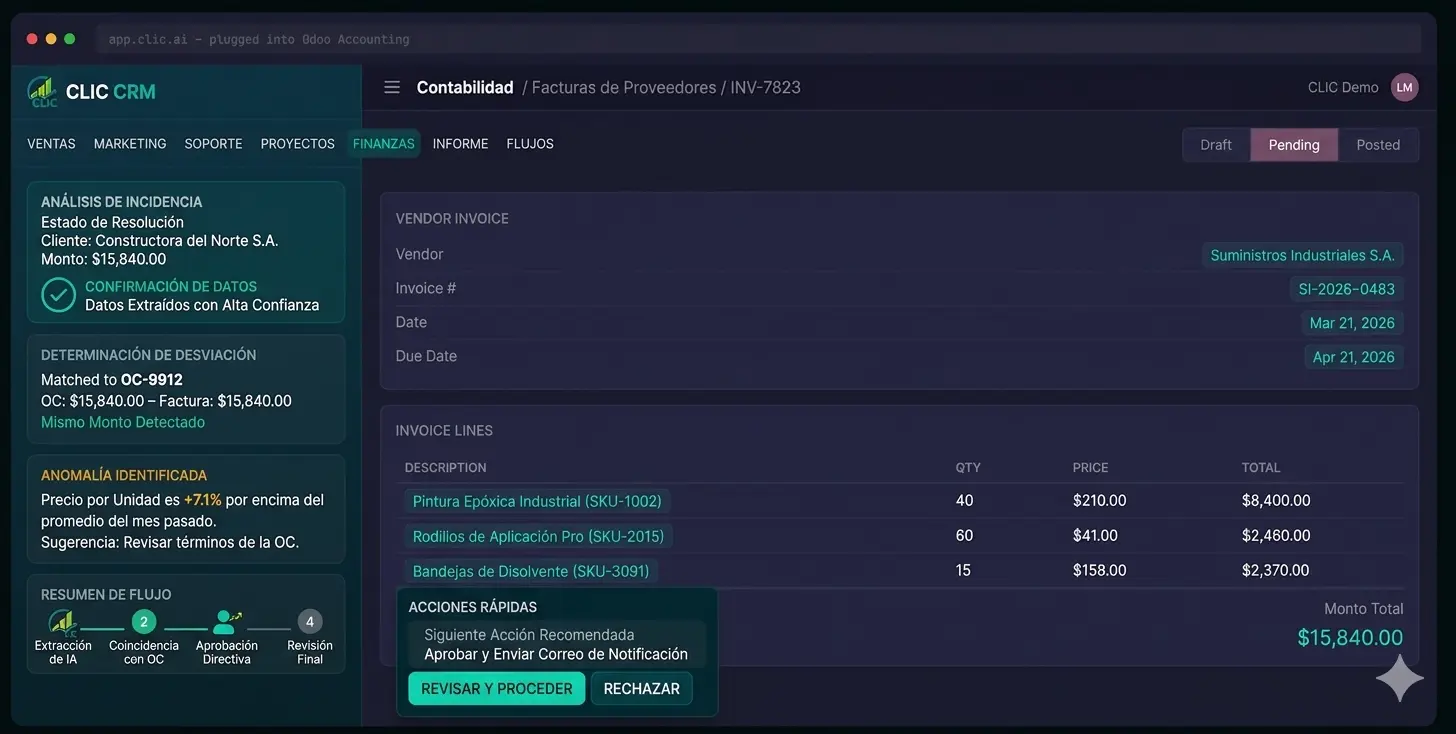 CLIC extrae datos de facturas de proveedores con un 96% de confianza, los coteja con órdenes de compra, marca anomalías y dirige las aprobaciones — mientras trabajas en Odoo Accounting.
