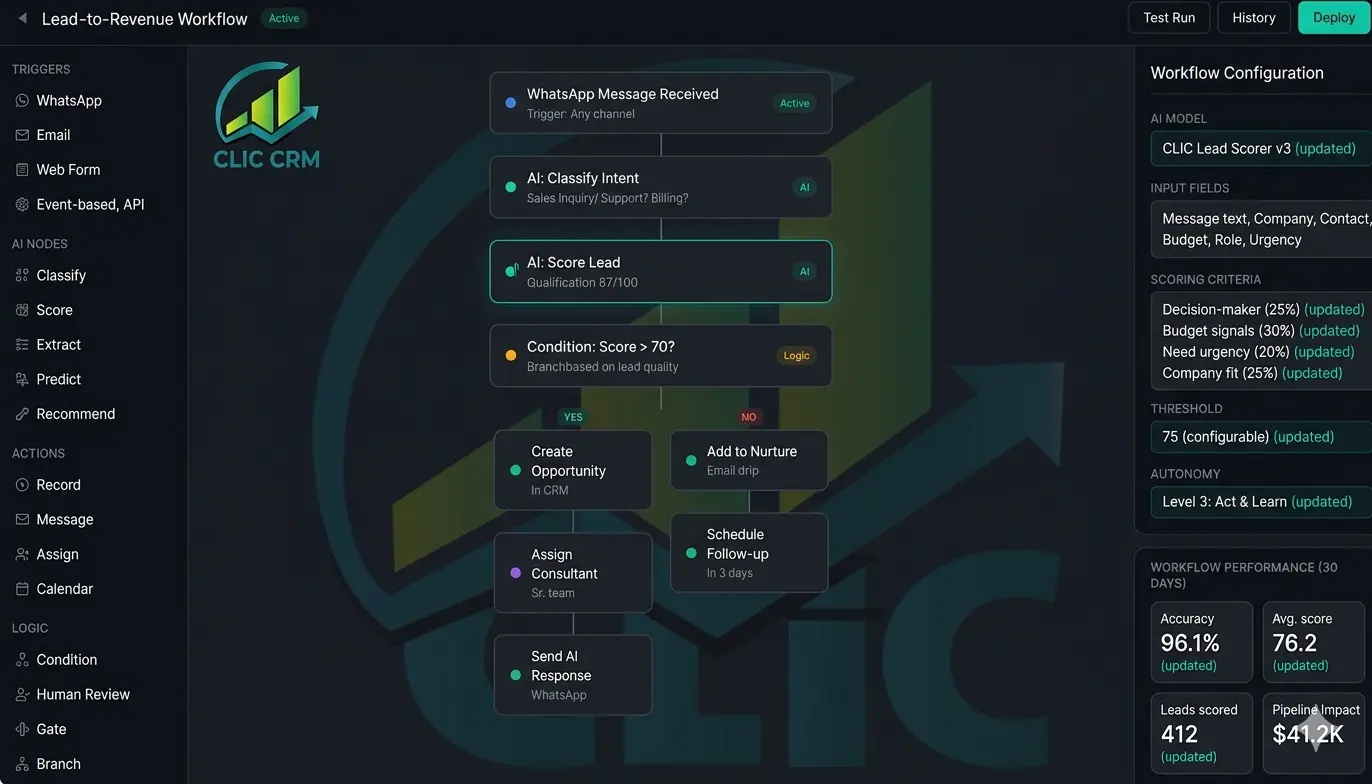 CLIC se conecta a cualquier sistema y añade inteligencia en todos ellos. Un solo panel de IA. Un solo modelo de datos. Contexto empresarial completo — sin importar qué herramientas uses.Desde la calificación de leads hasta la facturación, pasando por la búsqueda de conocimiento —CLIC razona a través de toda tu operación usando un modelo de datos canónico unificado.